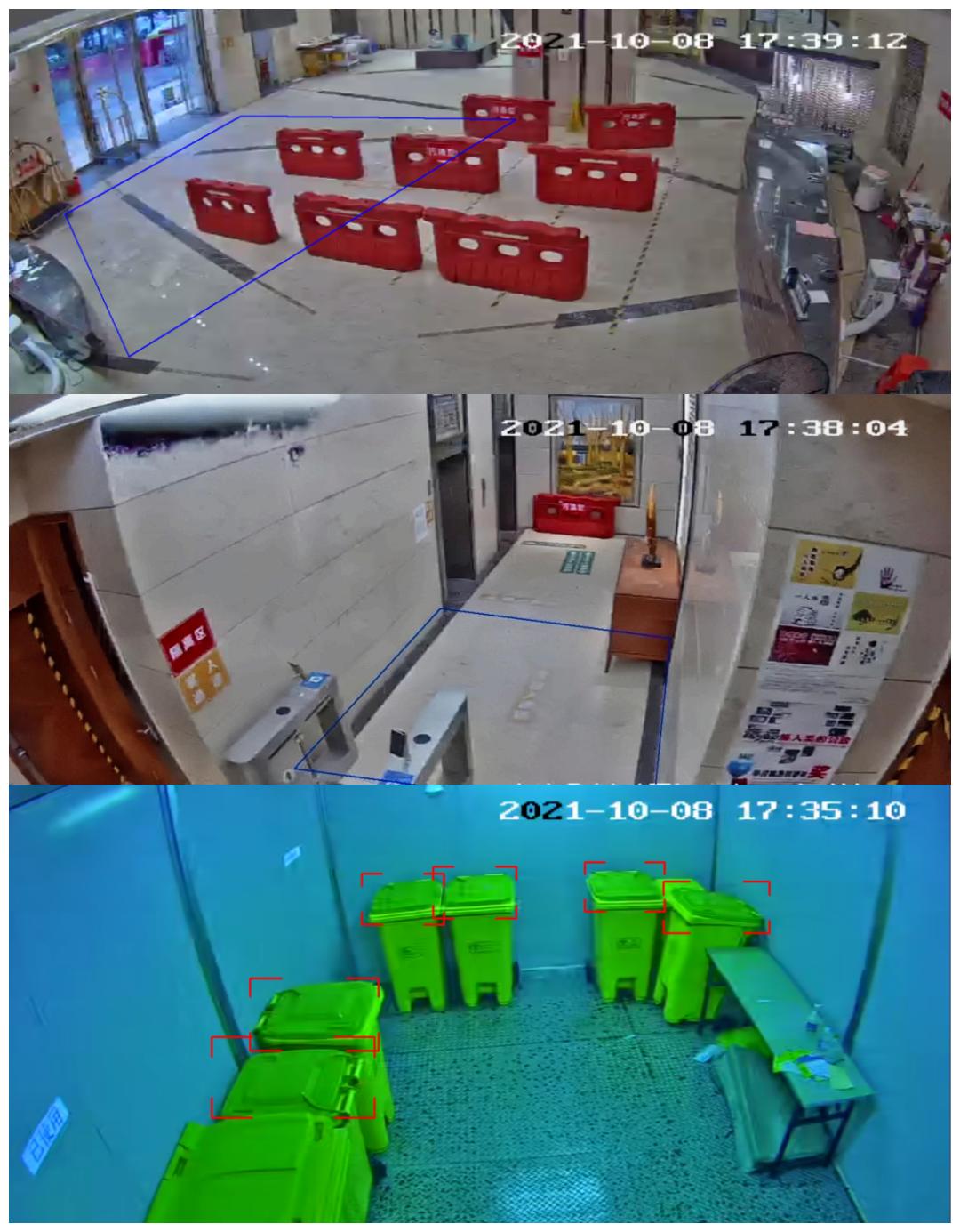 影像AI視頻監控攝像頭24小時監控AI影像監控,可對人員穿脫防護用品、室內垃圾消毒等17個重點監控事件進行預警和消除。